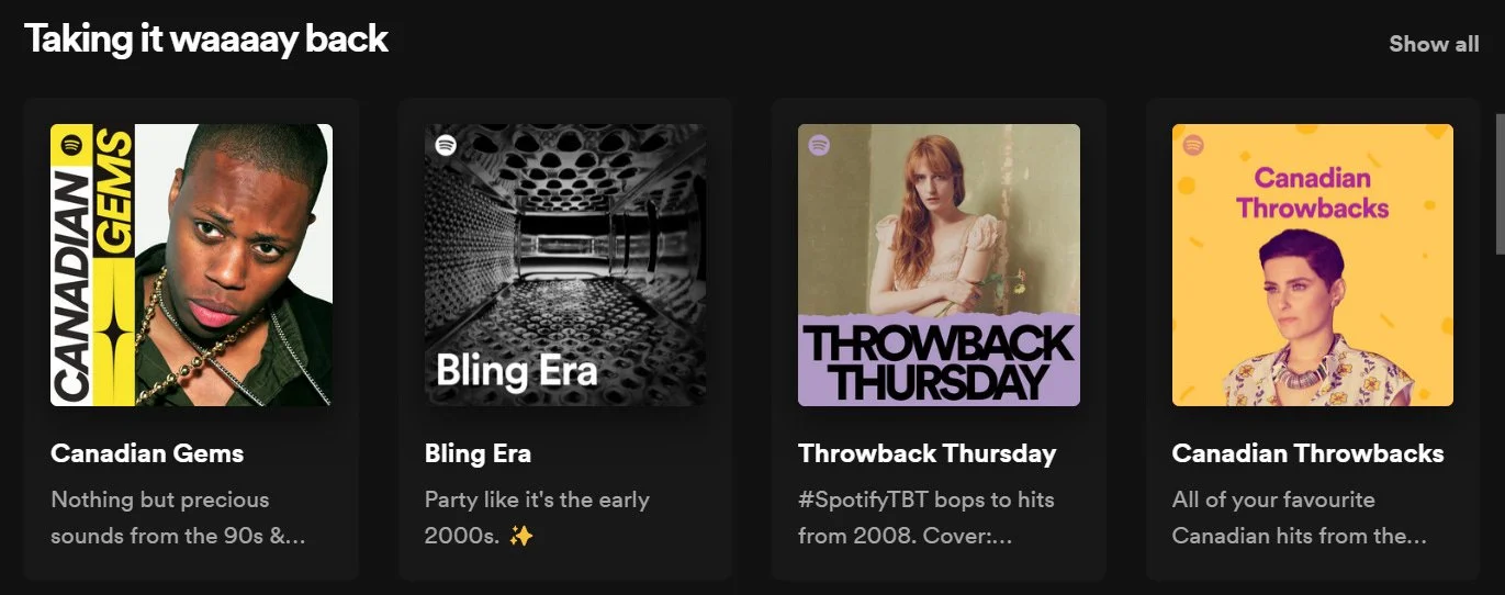 Like YouTube, you can’t really search for Canadian content on Spotify. It’s interesting to think about how Canadian content could be displayed in a key-word search.